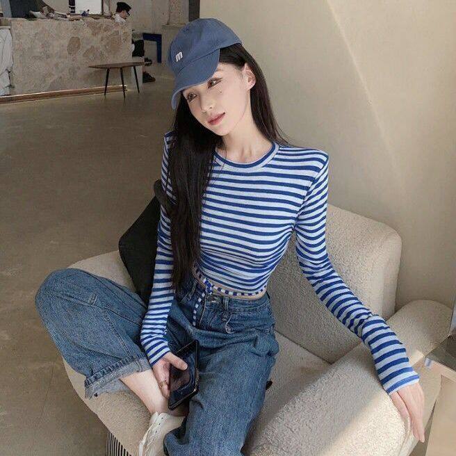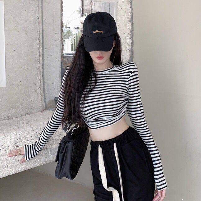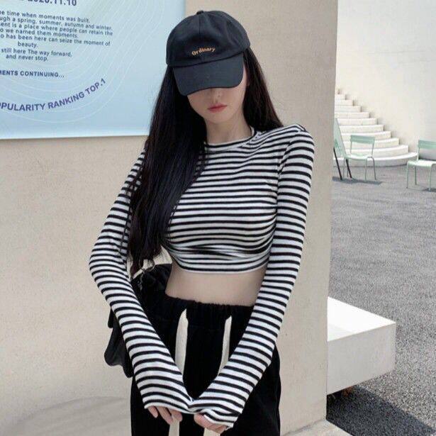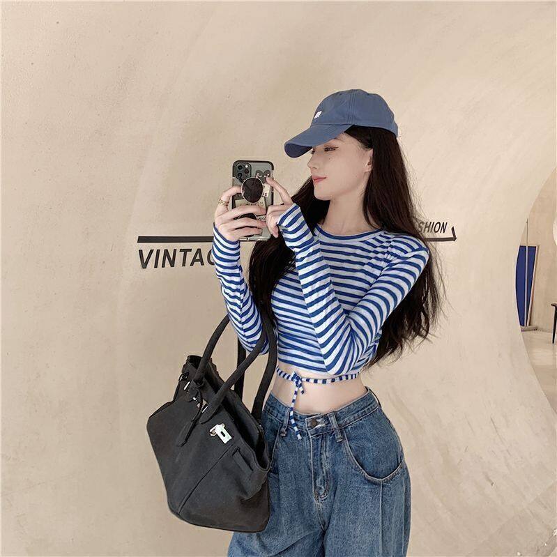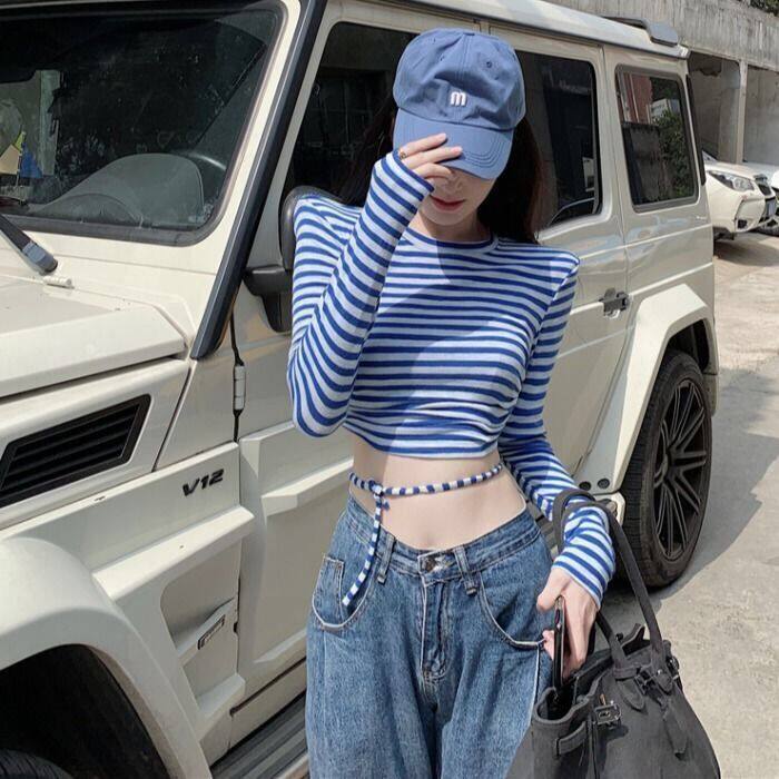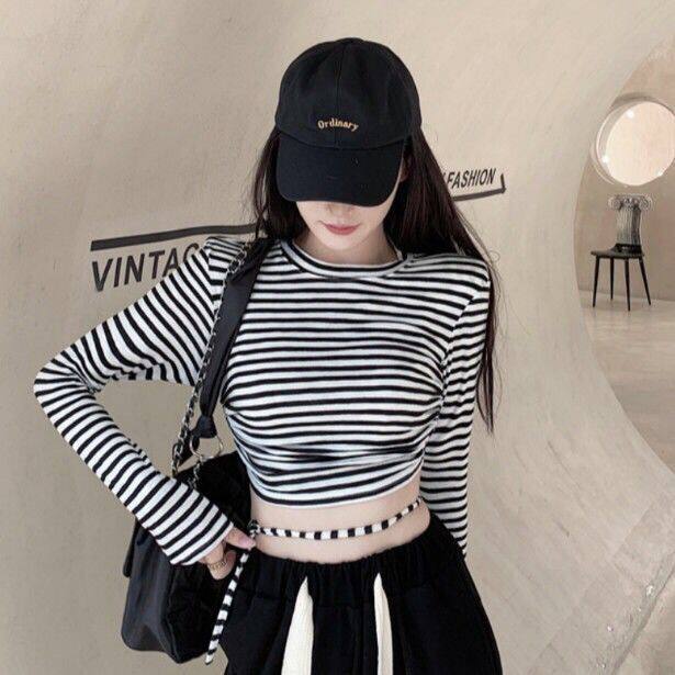 条纹T恤长袖彩色凹凸短款上衣